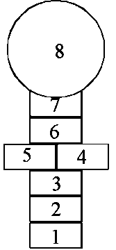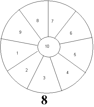 The figure for Roundy Beds (ümarkeks) consists of two circles, one within the other. The area between the circles is divided into 8-10 sectors which are numbered counterclockwise. The last number (usually 9 or 11) is written into the small circle (Fig. 1.8). The actions fall into two classes: in the first class the numbers are passed through either 1) hopping on one foot, finishing the series by landing both feet in the small circle, or 2) on two feet while either foot (L=left, R=right) must land in successive beds. Here hop 1L2R is followed by a backward hop (8L1R), and only then a hop forward 2L3R may follow. So the course of the player on the figure can be formulated as follows (backwards hops are in parentheses): 1L2R+(8L1R); 2L3R+(1L2R) etc. Unlike the other styles of Hopscotch, in which the main problem lies in hopping on one foot or backwards, Roundy Beds means problems in two-feet hopping. In Class 2 the player has to hop into beds dictated by the others. The maximum number of beds so dictated is three.
