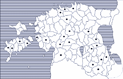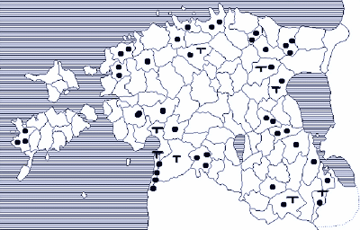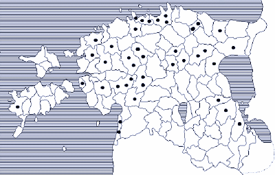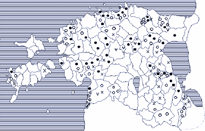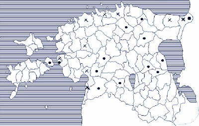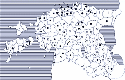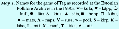 As a result of comparing those names with the game files available at the Estonian Folklore Archives it turned out that a considerable part of the list above represent a fairly old local tradition (see Map 1). In the old tradition, the most widely used names were kull and läts, the former of which would characterize the slightly preponderant eastern half of Estonia, whereas the latter would rather be used in the western part. But kull is met also in the Archives under many old names such as Crazy Dog (hullukoera mäng); Goshawk (kanakull), etc. Some names (The Tilling of Hawk's Land (kullimaa tegemine); The Picking of Hawk's Oats (kulli kaera katkumine); Hawks and Hen (kullid ja kanad) etc.) suggest a connection with old singing games. The variants, however, were fewer than can be found in modern material. According to the Archives the most popular Tag games played in the old were Stone, Wood, Squatting, Stump and Hummock Tags.