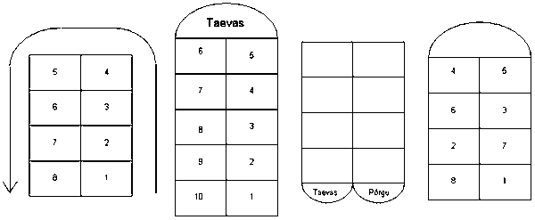 The figure used for Snail Beds (teokeks) is a spiral consisting of up to 30 beds. Sometimes a snail's head is added (Fig 1.7). The hopping is done either on one foot or feet together from the head of the snail to the centre, and if previously so agreed, all the way back as well. The "out" rules are as usual. A spiral faultlessly traversed entitles the player to an individual rest bed called maja `house', kodu `home' or puhkekodu `rest home'. The marked rest bed is reserved exclusively for the owner, nobody else may even land there. As every new class produces at least one new rest bed they are tried to be selected so as to make the owner's life as comfortable as possible - at the expense of the others. If two rest beds lie side by side, the other players have to make a longer hop into the next free bed. Home and House being old names for rest beds, the new one of Rest Home may lend its name of puhkekodu to the whole game. Descriptions of Snail Beds are predominantly from North Estonia, which was the case also in 1930. An additional questioning revealed that to a certain extent the game is also known in some other parts of Estonia. This game also enjoys an international repute.16