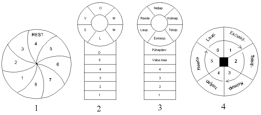 Besides hopping, the player has to quickly call out a word or name as required, thus exerting both her physique and intellect. The word classes remind one of the popular questionnaire-game called Bird, Animal. A few variants of Roundy Beds were noted down in the 1930s, Days of the Week (nädalapäevakeks) (see Fig. 3.4). In international tradition the round figure may occur either separately or as a component of a larger figure.