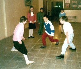 Another difference that looked relevant to the children was whether the games were played at school or at home. School games (ball games, social games) tend to require more participants. In home-played games the players are not so numerous, while the environment seems to favour various types of hide-and-seek and imaginative games. Writing games are played both at home and at a dull lesson. Breaks are suitable for running, girls' Hopscotch, and boys' football (that can also be played with an old beverage can, for example). A sports lesson will naturally include some sports games, at class parties one cannot do without social games. As games played at home during birthday parties must usually fit into a rather confined space, various writing games are played there, including quizzes of an intimate kind.