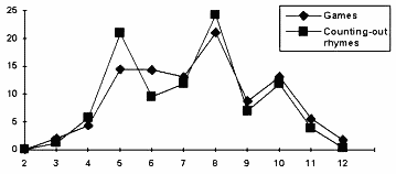 The practically coincident beginning and end of the two graphs on Diagram 2 are evidently the result of the age limits of the participants as well as of the staying aside of the first-formers and the school-leavers of both basic and secondary school. The differences can be accounted for by the specific traits of the two kinds of material and the different attitudes assumed towards them by different age groups. A fifth-former will find it much easier to put down a counting-out rhyme or a game-starting formula than to describe a game. Forms 6-7 stand out for the pupils' wish to look more adult in every respect and their studious effort to avoid looking childish in any way. This may well be the reason underlying the sharp drop in the counting-out rhymes sent in by this age-group.