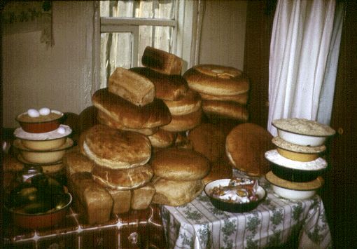Gifts were received by an older woman who placed them on a table. Povodimovo, July 1989.