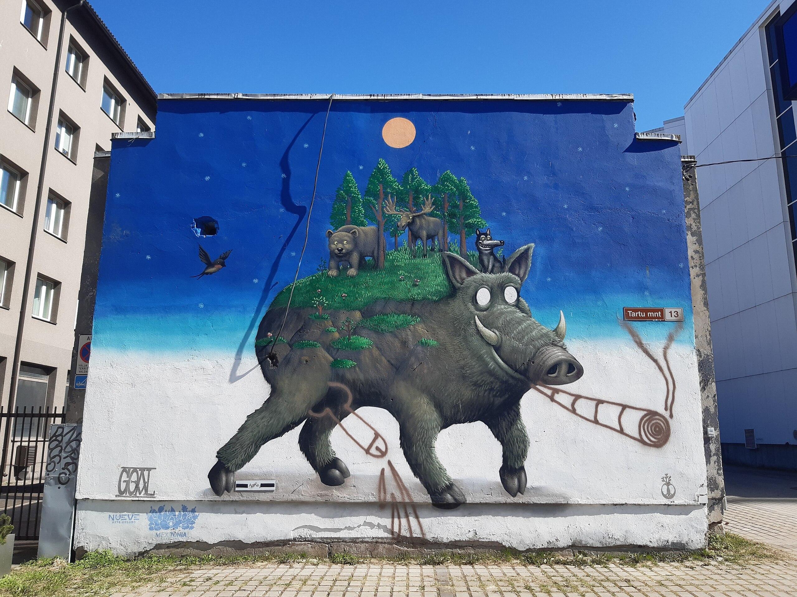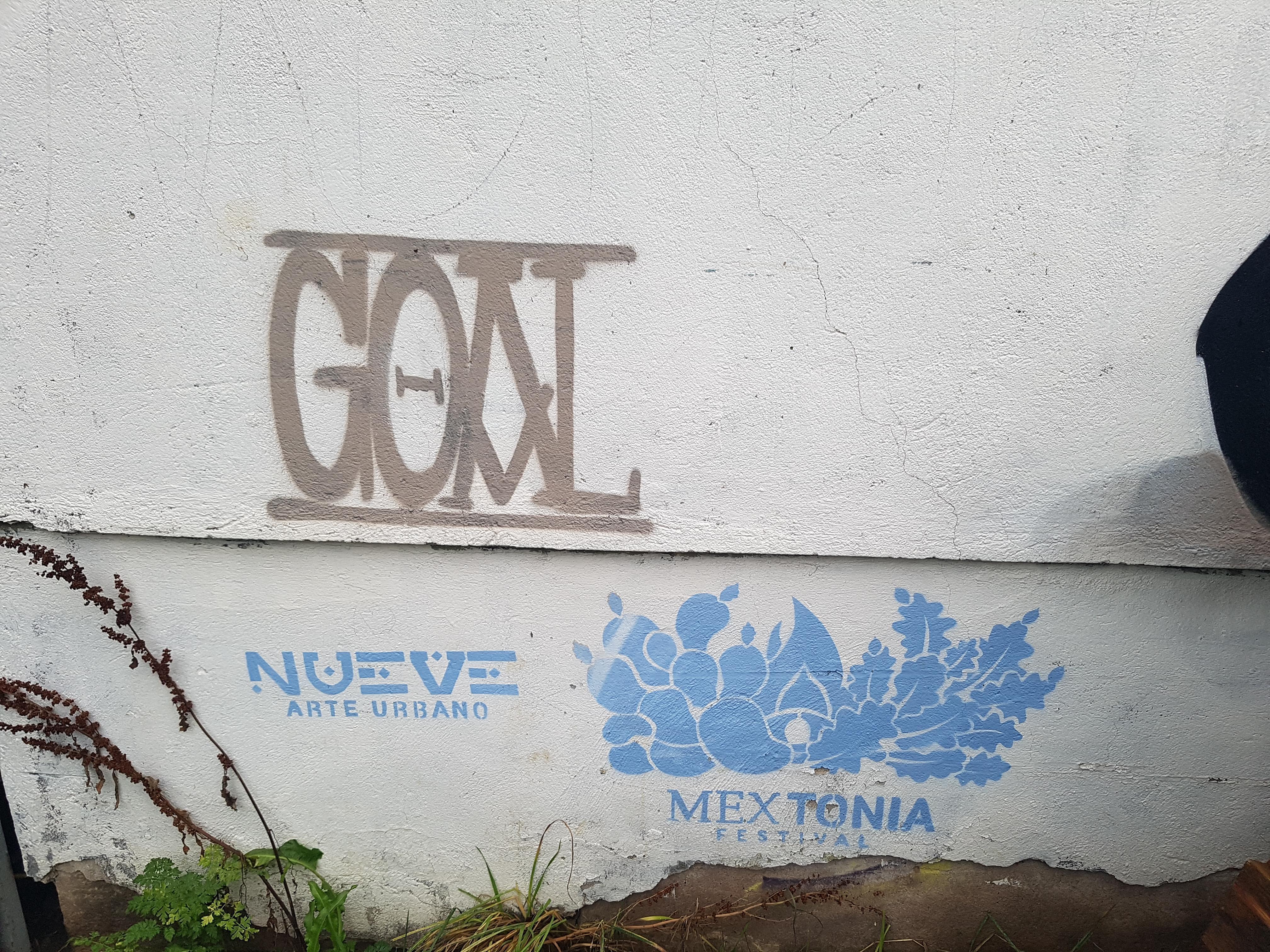 [Kosmoloogiline seinamaal (mural) „Metsavaim“; autori logo ja signatuur:] GOAL / NUEVE ARTE URBANO / MEXTONIA FESTIVAL