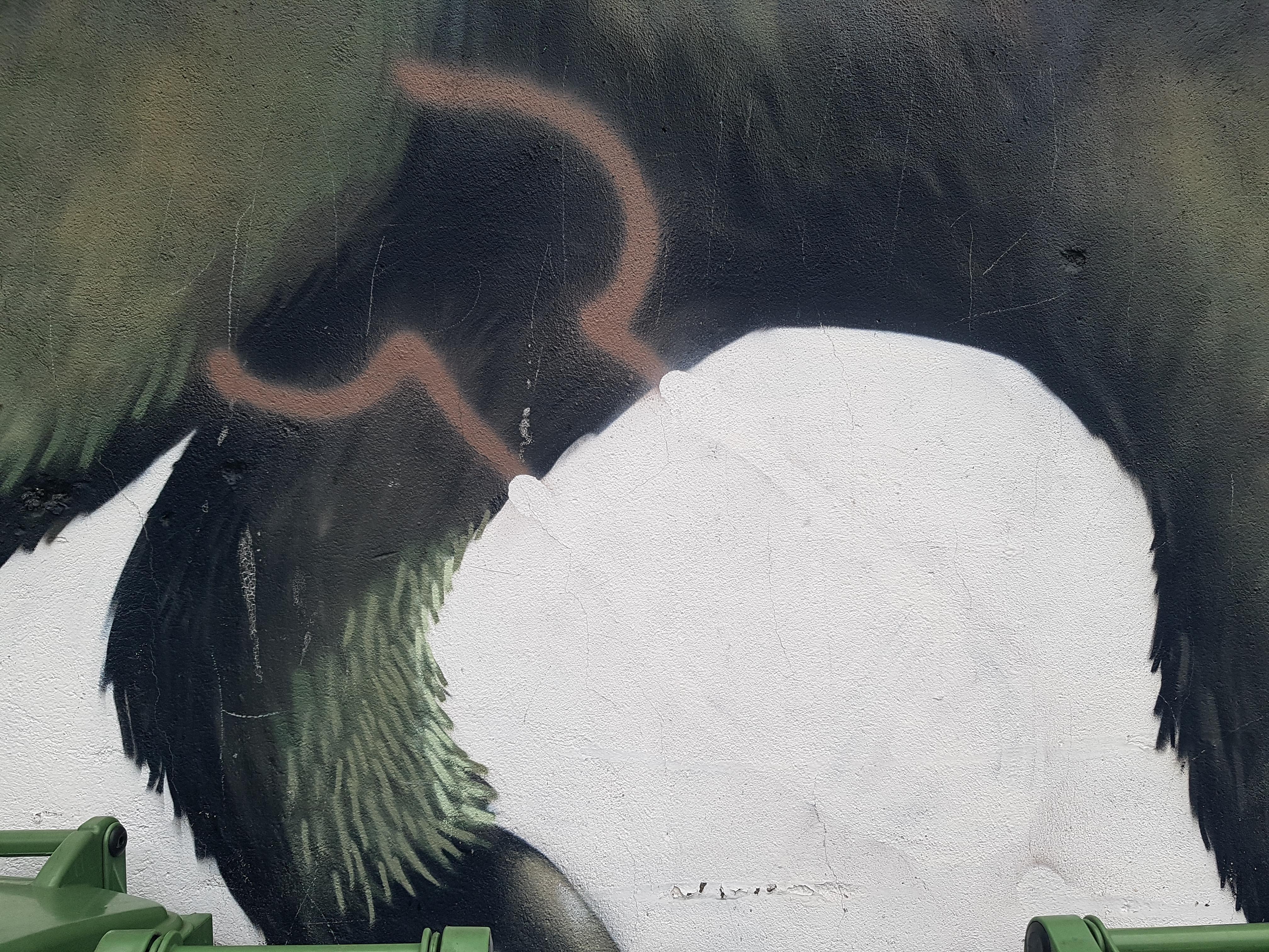 Keegi teekonna alguses olev grafitilooja on teost omatahtsi täiendatud. Iroonia on siin selles, et ka täiendused on kosmoloogilised. Kuldile on joonistatud muidu puhma varju jääv skrootum ja suur erekteerunud peenis. Sellest purskub seemet, mis annab elu ka valgele jäisele maailmaosale all. Suhu on talle joonistatud tossav sigar, mis võiks sümboliseerida (Meso-Ameerikale omast) allilmast läbi vulkaanisuudme tõusvat suitsu. Kuid vaevalt autor nii mõtles. Keegi kolmas „autor“ (allilma isand, saatan, kurat?), on aga kuldi peenise maha lõiganud (kustutanud) nii, et kult ei saaks enam kedagi ega midagi viljastada. Seejuures on skrootum alles jäetud. Ka sigar on kuldi suust eemaldatud (kustutatud), et takistada sidet allilma ja maarahva vahel, kuid sigarist tõusnud suits on alles. Lähemal vaatlusel on siiski nii peenise kui ka sigari jäljed müüril näha. Lisamärkus: nii peenis kui ka sigar võivad olla allomotiivid, st vastastikku asendatavatena tähendada ühte ja sedasama asja või nähtust.