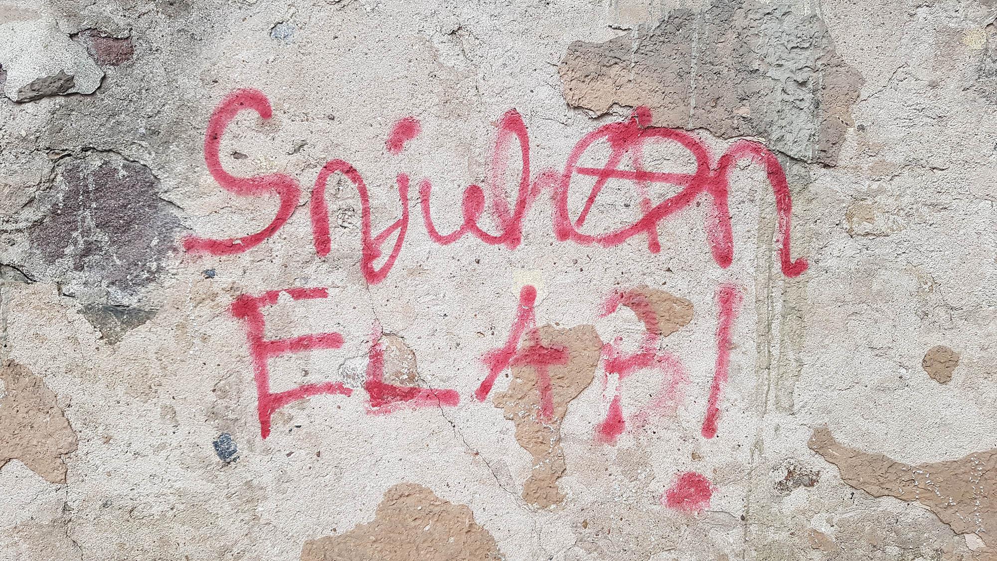 Järgmine grafiti eelmisest paremal „SnjuhAn / ELAB!“ siasaldab anarhiamärki ring-A, mis asendab väikest a-d (siin: nimes edasi antud kui suur A).