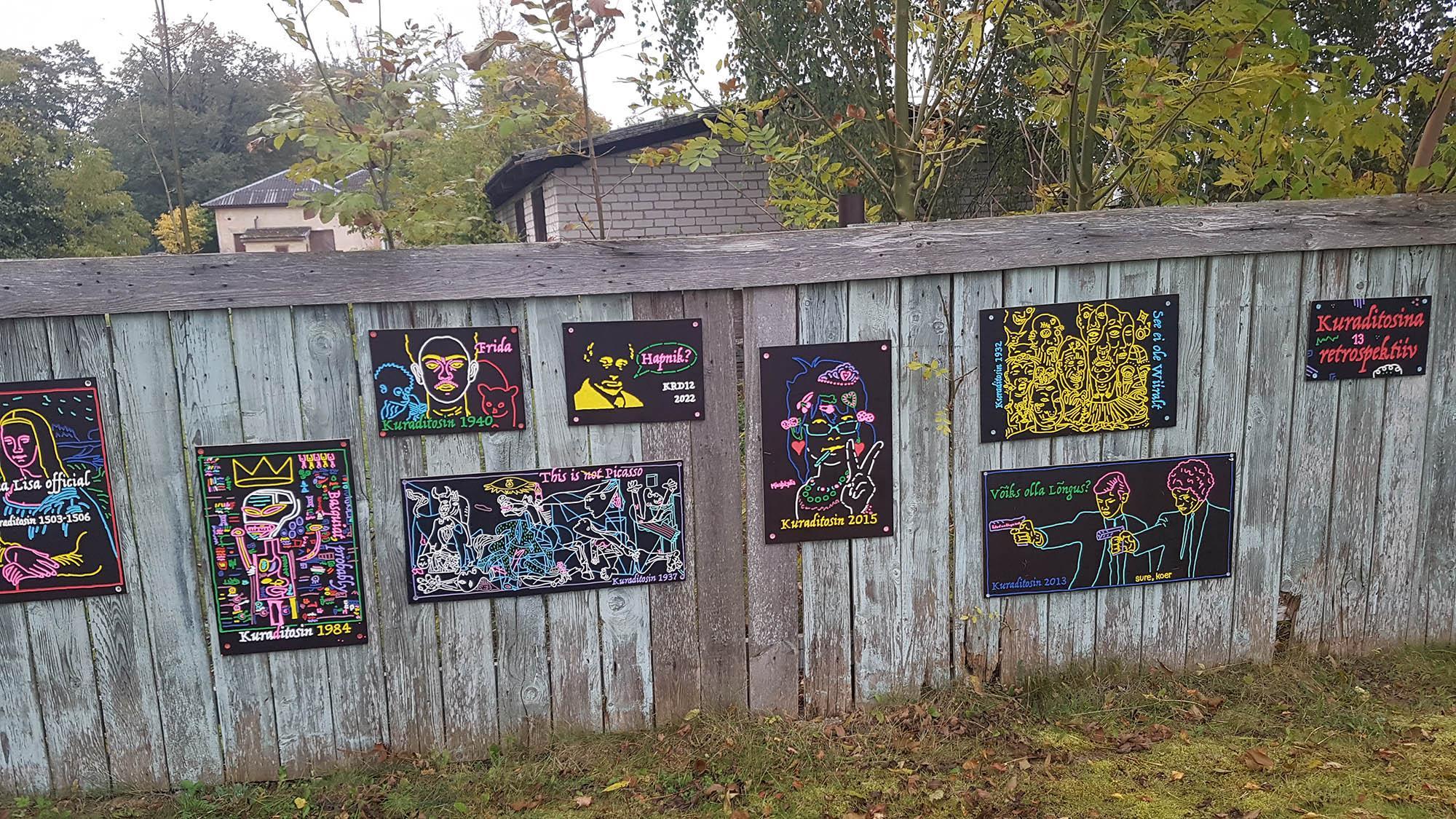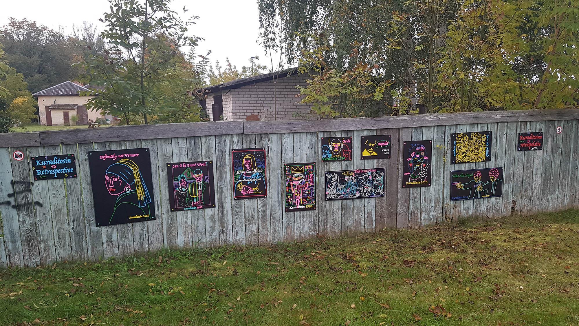 Kinnistu Vaksali 18 Näituse tn poolsele plangule Tartus on kruvidega kinnitatud 12 teost, neist esimene ja viimane on informatiivsed. Intertekstuaalne retrospektiiv käsitleb läbi Kuraditosina loomingu maailmakunsti tähtteoseid. Tartu Kunstimaja ühel veebilehel seisab, et „Kuraditosin on salapärane autor, kelle kohta pole mitte midagi teada. Mõnikord on teosed allkirjastatud KRD12.“ Tema tehnikaks on „filmivineer, käsifrees ja värvimarkerid“. Retrospektiivi ette on paigutatud väike liiklusest tuntud keelumärkide eeskujul loodud märk „Pildistamine keelatud“. Oma fotosid siia üles laadides „rikkusin“ seda keeldu. Esitan siin plangule kinnitatud pildid ja neil olevad tekstid järjekorras vasakult paremale:
