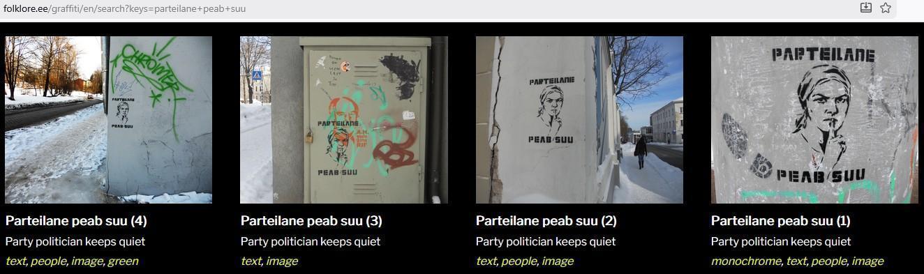 2. Kuvatõmmis grafiti andmebaasist nelja parteilasega <https://folklore.ee/graffiti/en/search?keys=parteilane+peab+suu>.