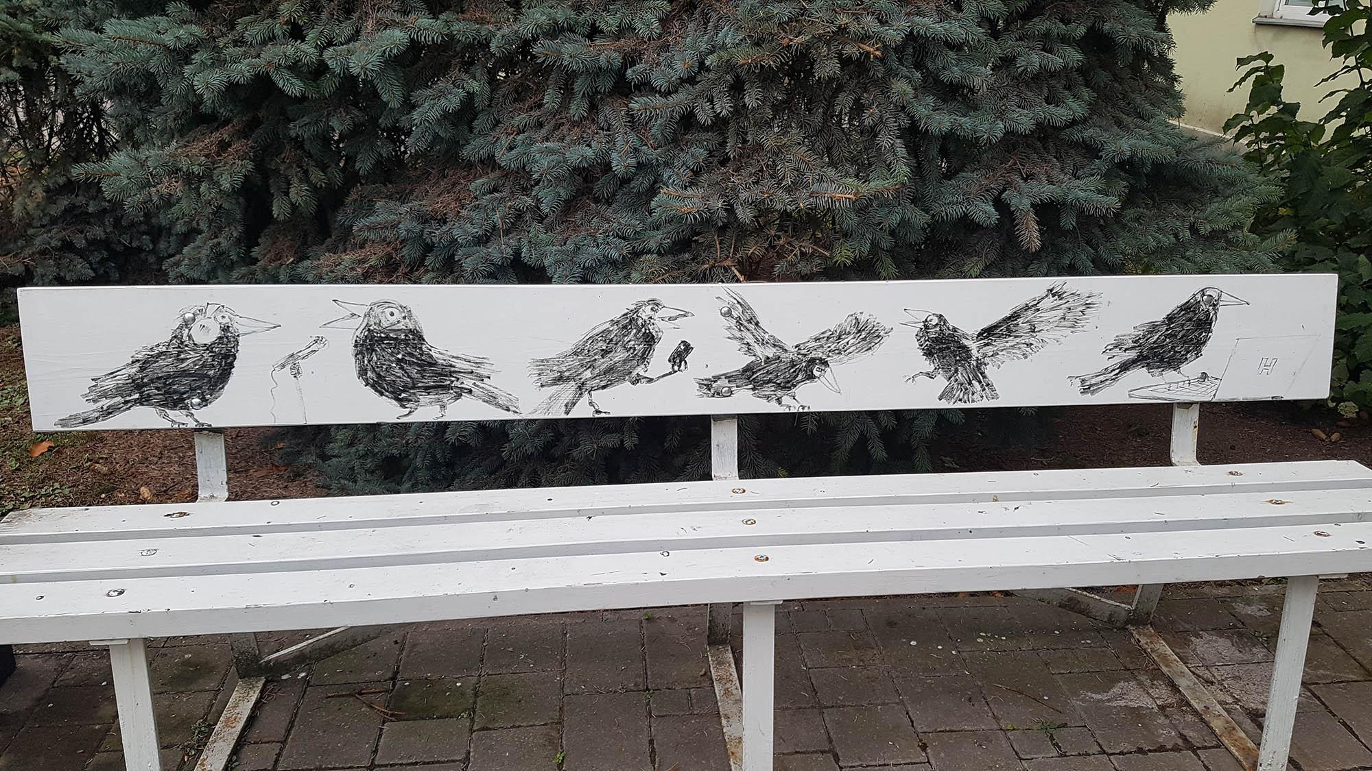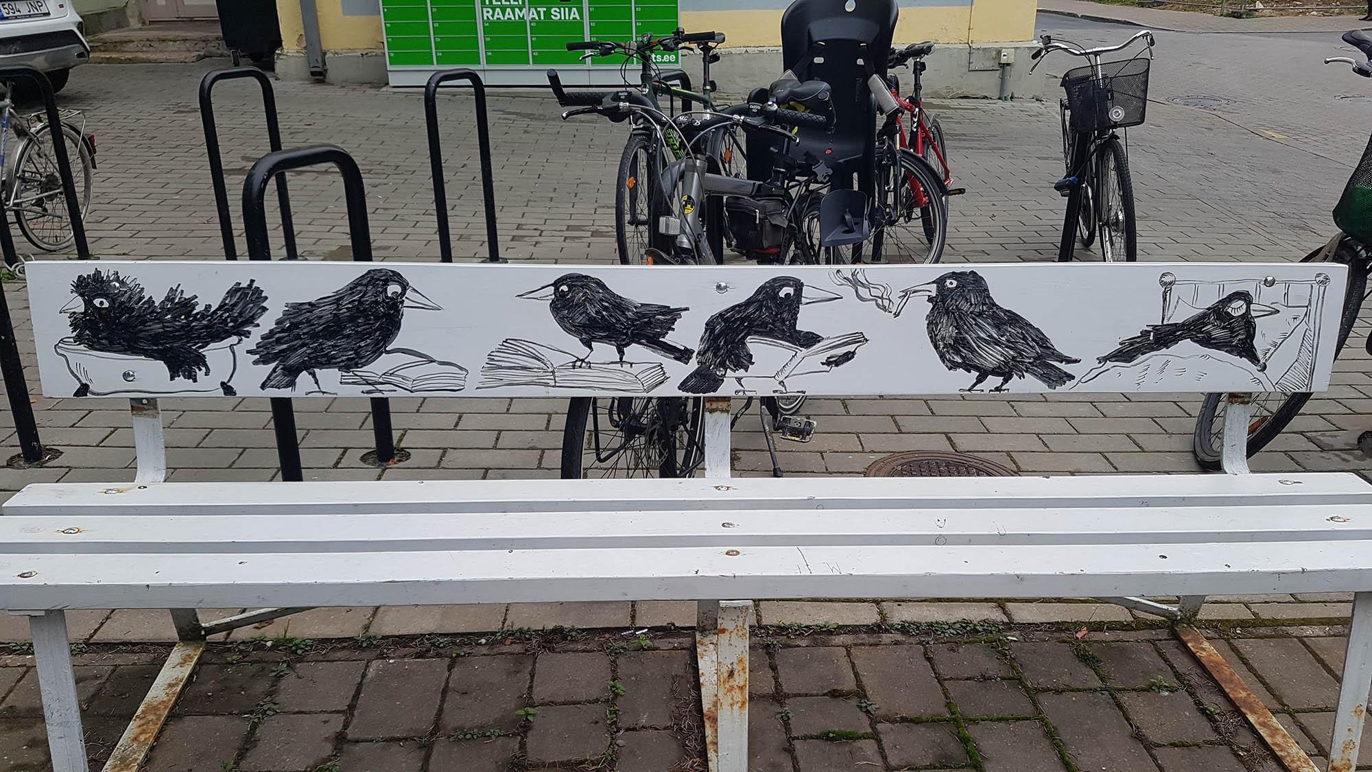 Tartu linnaraamatukogu ees on neli pargipinki, mille seljatugedel on kunstnik ja disainer Artur (Kuus) Tuur kujutanud antropomorfseid Tartule iseloomulikke hakke, keda on kokku 26. Kui me seisame näoga raamatukogu poole, siis kellaosuti suunas liikudes esimesel pingi seljatoel on kujutatud hakki, kes maalib, istub vetsupotil, vaatab end peeglist, kraaksub tiivad laiali, st peab kõnet, hakiema lapsega ja hakki, kes tahab suitsukoniga õhupalli tonksata; õhupallil keskele on paigutatud metallplaat (vt allpool). Teisel pingil on üks hakk vannis, teine, kolmas ja neljas loevad raamatut, seejärel hakk suitsetab (vt allpool) ja lõpuks hakk magab voodis. Kolmanda pingi seljatoel hakid lõõgastuvad, esimesed kaks tipsutavad pokaalidest veini, seejärel on kolm hakki tegevuses kaarsillal, neist esimene hakkab jalgrattaga kaarest üles sõitma, teine istub kaarel nagu mõni üliõpilane ja kolmas hakkab teiselt poolt tõuksiga kaarele sõitma, seejärel istub üks hakk postamendil ja viimaks tonksab üks hakk ümmargust varrekesega kera, vbl et õuna. Viimasel pingil hakkide lõõgastumine jätkub: esimene hakk kuulab kõrvaklappidega muusikat, teine laulab mikrofoni, kolmas ilmselt sõrmitseb moblat, viies ja kuues tantsivad ning viimane kas vaatab midagi läpakast või tšätib sotsiaalmeedias. Vt ka <https://tartu.postimees.ee/7937899/linnaraamatukogu-pinkidel-laiutavad-hakid-nagu-kahejalgsed-tiivutud-tartlased>.