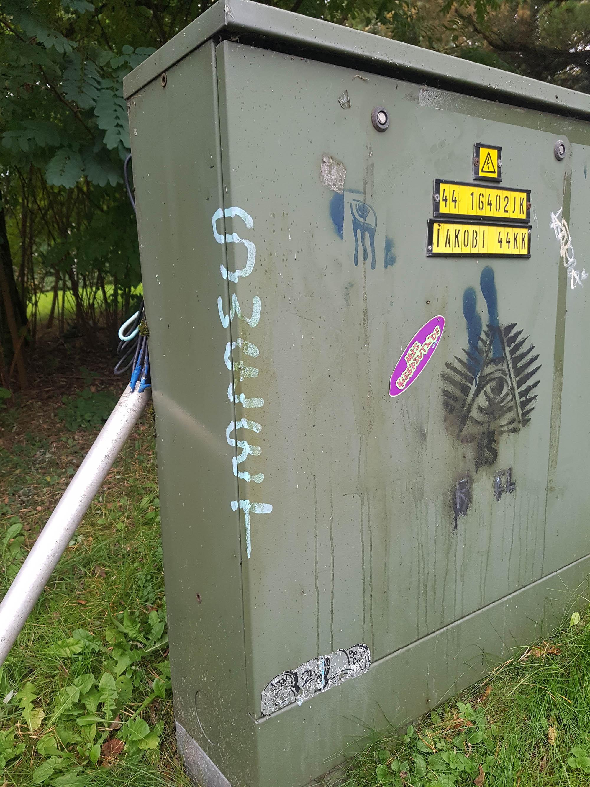 Lisaks on kapi vasemale nurgale ülalt alla kirjutatud „SWEET“ (magus) nii, et püstistest tähtedest on vasem tähe pool kapi osaküljel ja parempoolne osa kapi esiküljel. Lisaks on elektrikapil paremal loetamatu lühike egotekst, mis arvatavasti asub kahe korrapäratu pentagrammi vahel. Samuti on elektrikapil paar kleepsu.