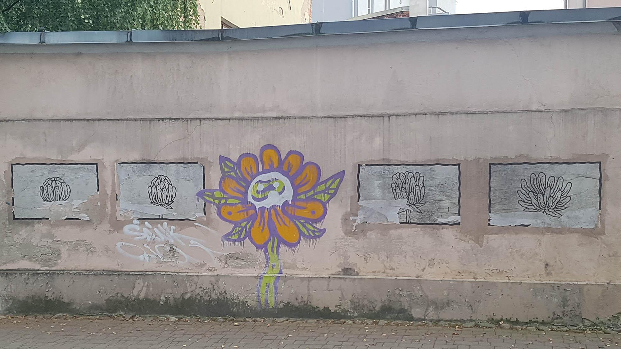 Neli monokroomset lillepilti ja nende keskel asuv polükroomne lillepilt asuvad Lai tn 33 õue müüril värava ja naaberkinnistu Magasini tn 12 vahel.