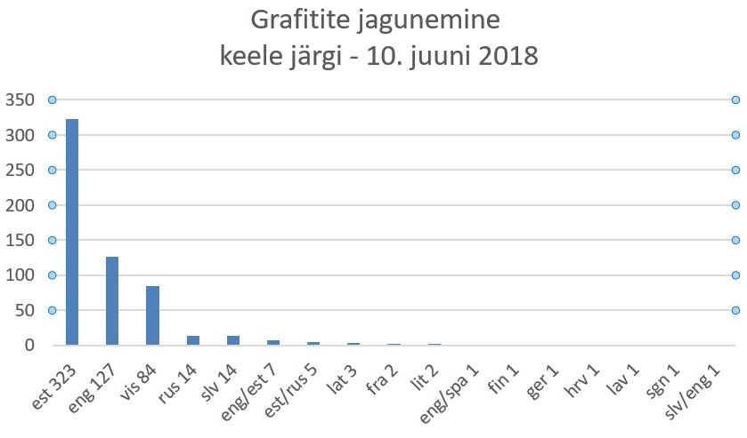 Põhiosa valimi tekstidest on eesti keeles. Tartus, kus eestikeelsed elanikud moodustavad umbes 75% ja venekeelsed umbes 15% rahvastikust, polegi üllatav, et sageduselt teisel kohal on ingliskeelsed (inglise keele toimejõud on