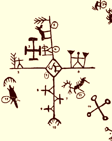 | XVII sajandi algusest pärineva shamaanitrummi keskosa. Kjellström 1991: 112 järgi. Kõrvutamine eelmise illustratsiooniga lubab pidada põdrakujutist päikeseks. Põder vibuküti ees võib väljendada äikesejumaluse ohvrit (vt Mäetagused, nr 9). Trummikujutiste identifitseerimine ja interpreteerimine pole veel lõppenud. |