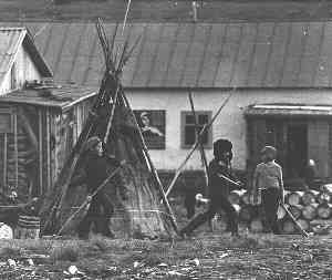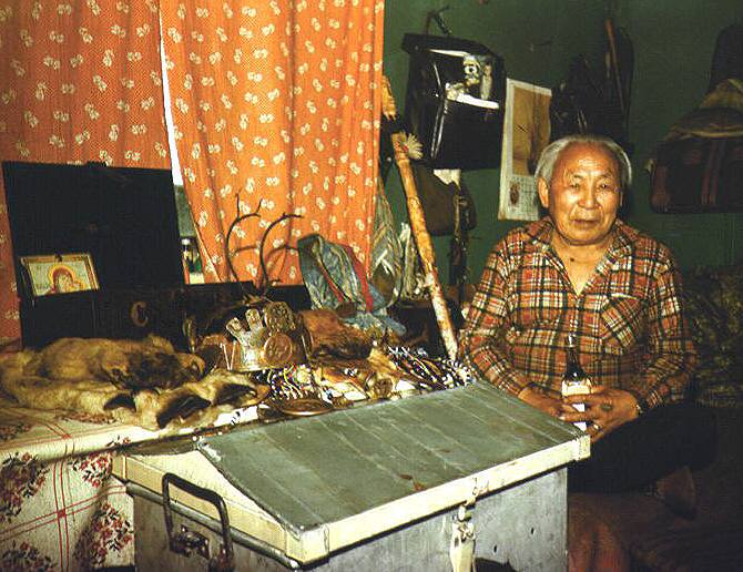 Demnime Kosterkin is shamanising in his tent near Ust-Avam village. His son Dulsymyaku is assisting him. Photo (65K) by A. Lintrop 1977. Participating in father's séances gave Dulsymyaku many experiences in singing shaman songs, drumming, divination etc.