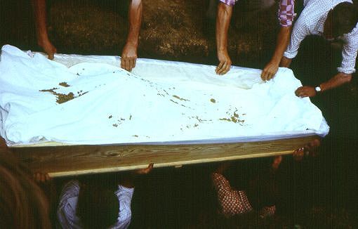 In Povodimovo, summer 1989, the opened coffin was received by two men standing in the bottom of the grave. The grave was wide and two meters deep.