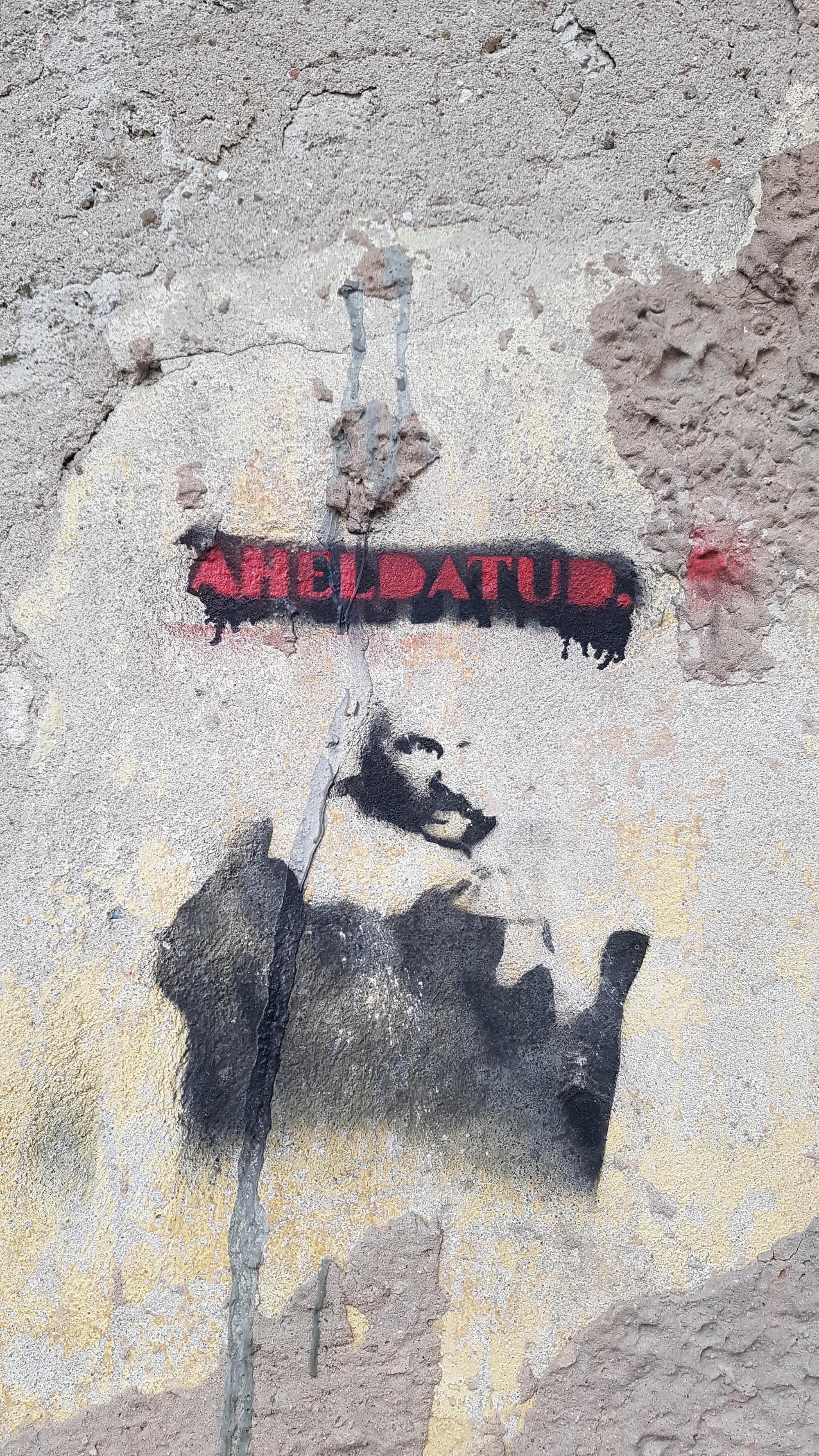 Šablooniga kirjutatud tekst „AHELDATUD.“ ning selle juures mehe pooliku peaga rinnaportree leiduvad ka Tartus Veski tn 2, kus on siiski pikem tekst: „Tõde on see, et me oleme AHELDATUD“, vt <https://www.folklore.ee/graffiti/grafitid/tode-see-et-me-oleme-aheldatud>.