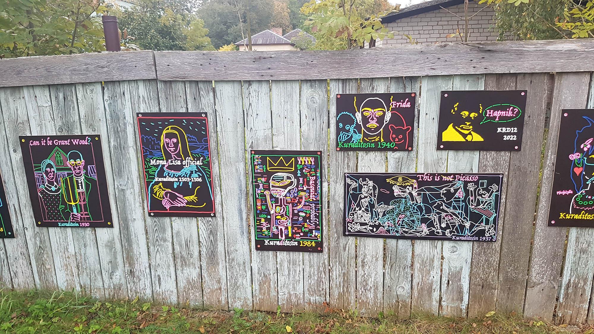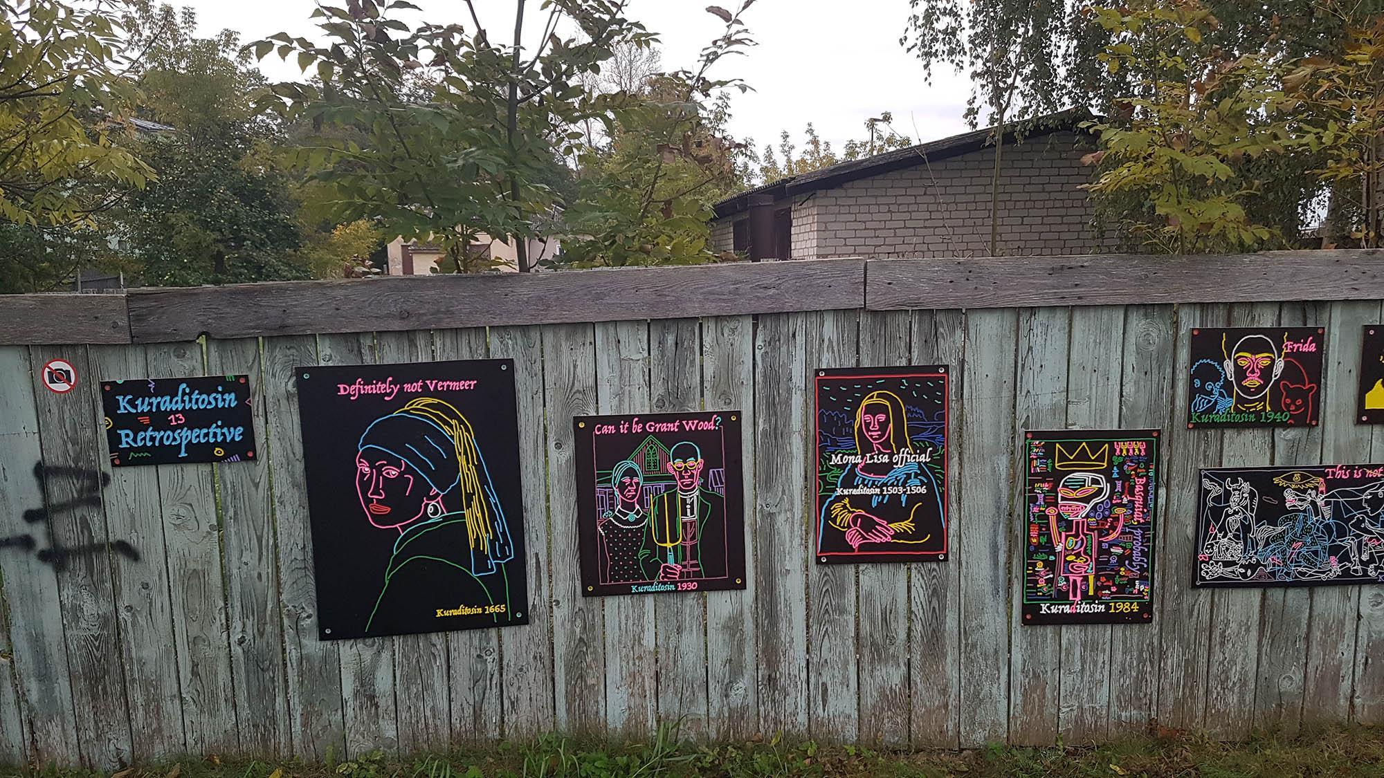 Kinnistu Vaksali 18 Näituse tn poolsele plangule Tartus on kruvidega kinnitatud 12 teost, neist esimene ja viimane on informatiivsed. Intertekstuaalne retrospektiiv käsitleb läbi Kuraditosina loomingu maailmakunsti tähtteoseid. Tartu Kunstimaja ühel veebilehel seisab, et „Kuraditosin on salapärane autor, kelle kohta pole mitte midagi teada. Mõnikord on teosed allkirjastatud KRD12.“ Tema tehnikaks on „filmivineer, käsifrees ja värvimarkerid“. Retrospektiivi ette on paigutatud väike liiklusest tuntud keelumärkide eeskujul loodud märk „Pildistamine keelatud“. Oma fotosid siia üles laadides „rikkusin“ seda keeldu. Esitan siin plangule kinnitatud pildid ja neil olevad tekstid järjekorras vasakult paremale: