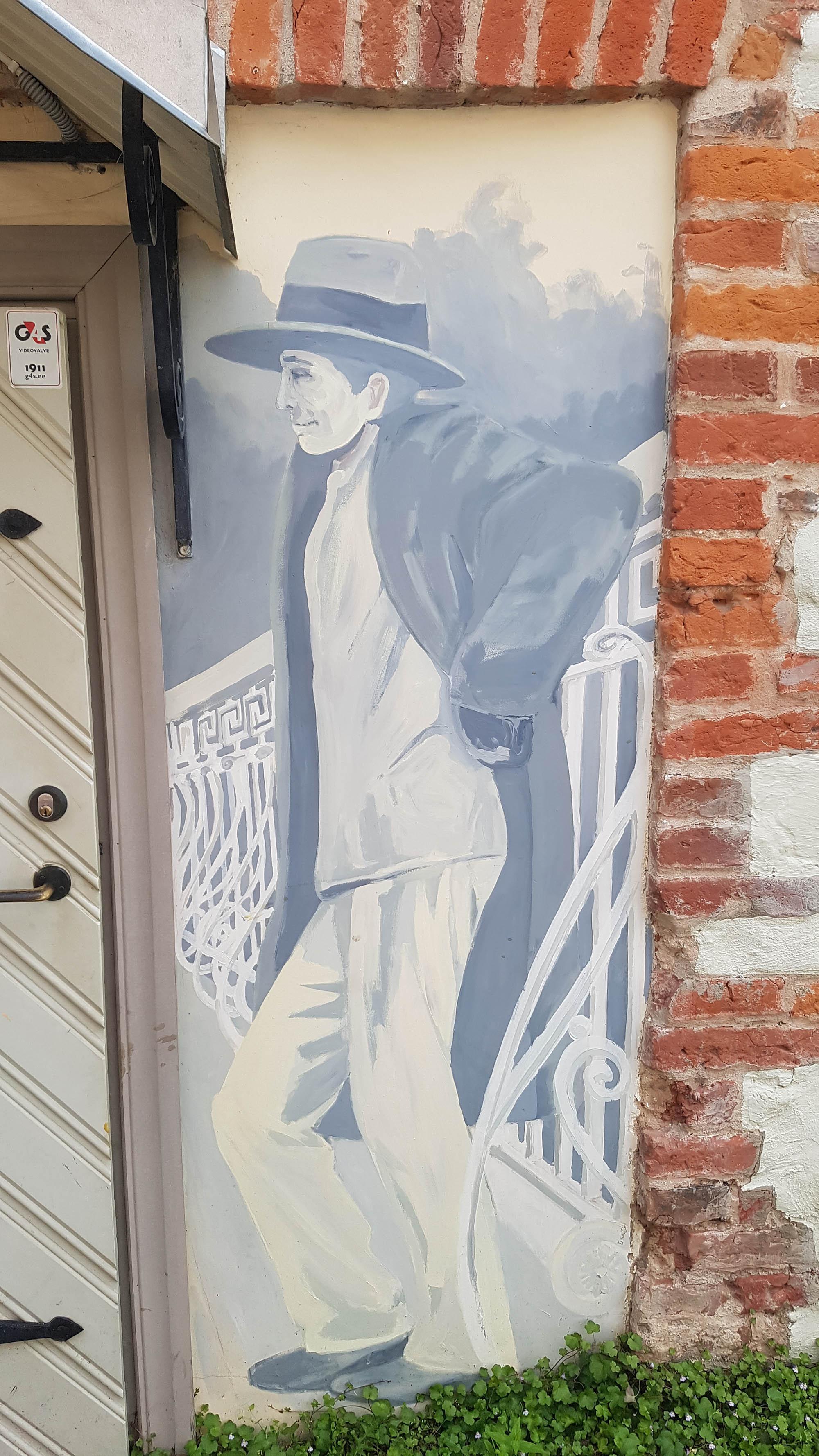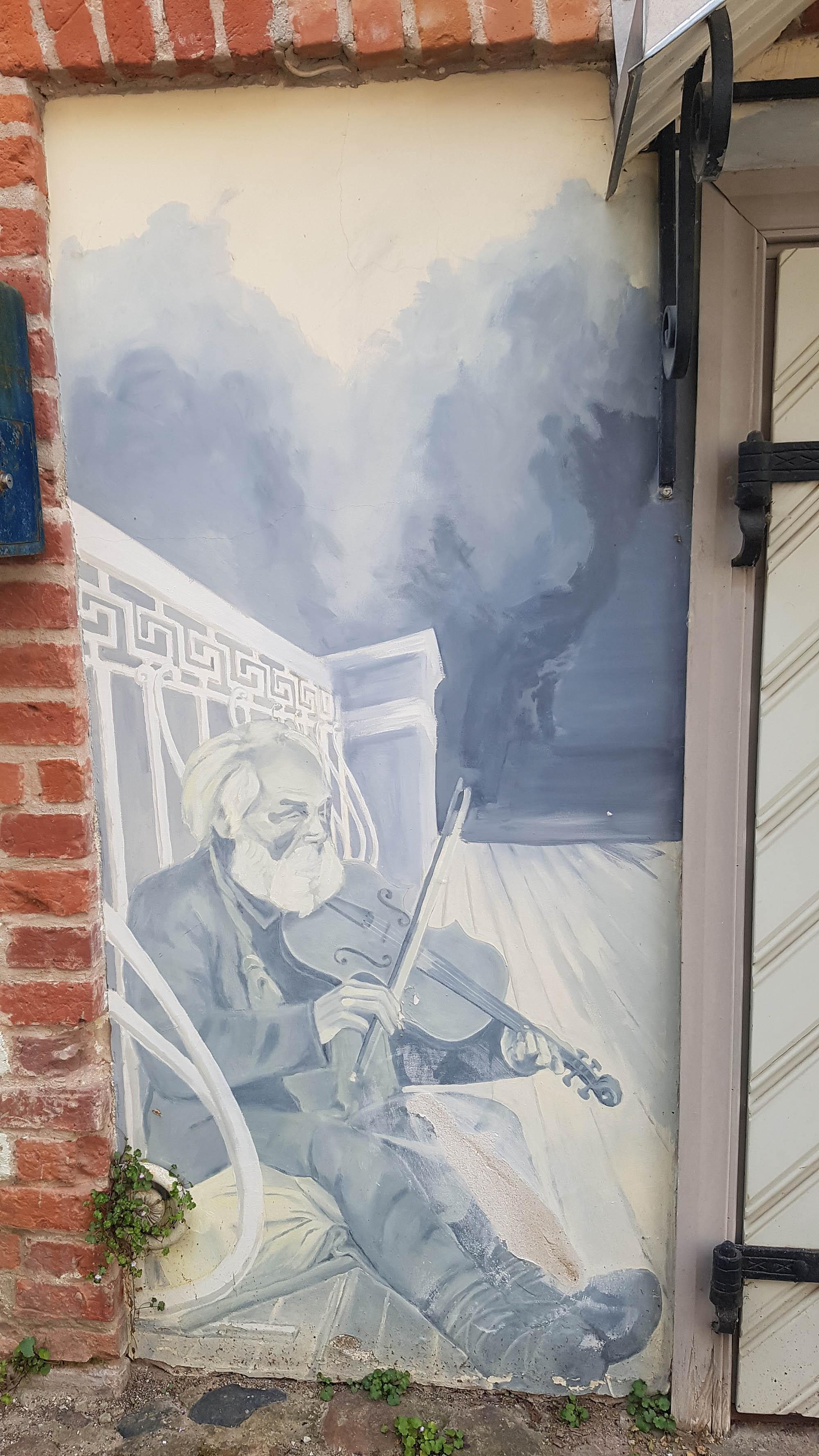 Paremal pool ust on sama kunstnik samade värvide ja samas stiilis maalinud nooremapoolse mehe, kes nõjatub Inglisilla teisele poolele vastu piiret ning jälgib viiuldajat ja kuulab viiuli helisid. Olemas Google’i tänavavaatel mais 2012.