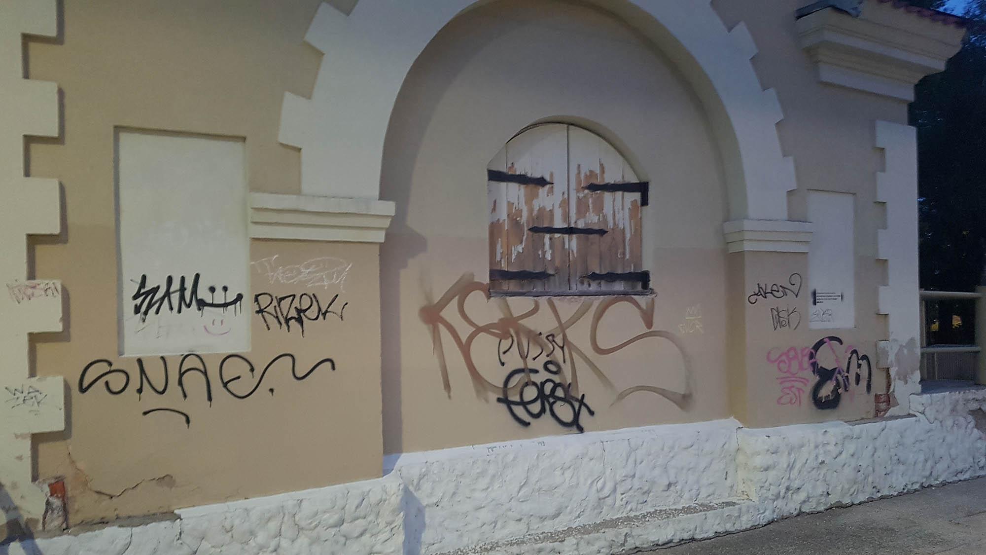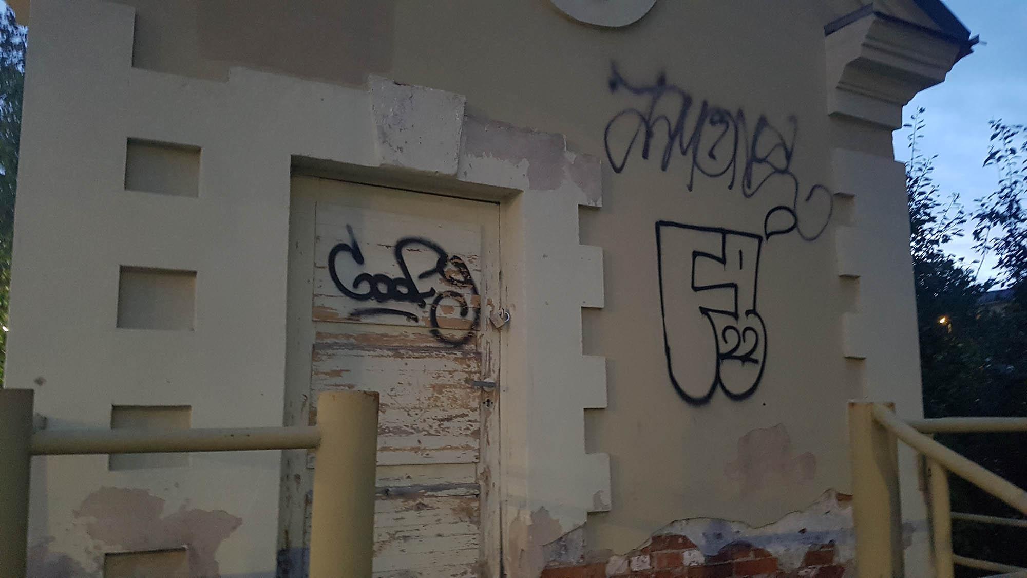 Katastriüksuse Vaksali 6b jaamahoone poolne hoone 1. perrooni ääres. Hoone esiküljel on pikem trafaretiga kirjutatud väikeses kirjas neljarealine tekst „niisiis ma tõotasin endale / et kavatsen järgmise suve veeta / nagu see oleks mu viimane / siin elus“ ja arvukalt üksikuid sõnu. Hoone jaamapoolsel küljel on Goofy jt tekstid. Tekst Goofy on Tartus väga levinud. Ilmselt signatuur, mitte viide Disney antropomorfsele multifilmi koerale. Pigem samastab signatuuri autor end selle multifilmi tegelasega.