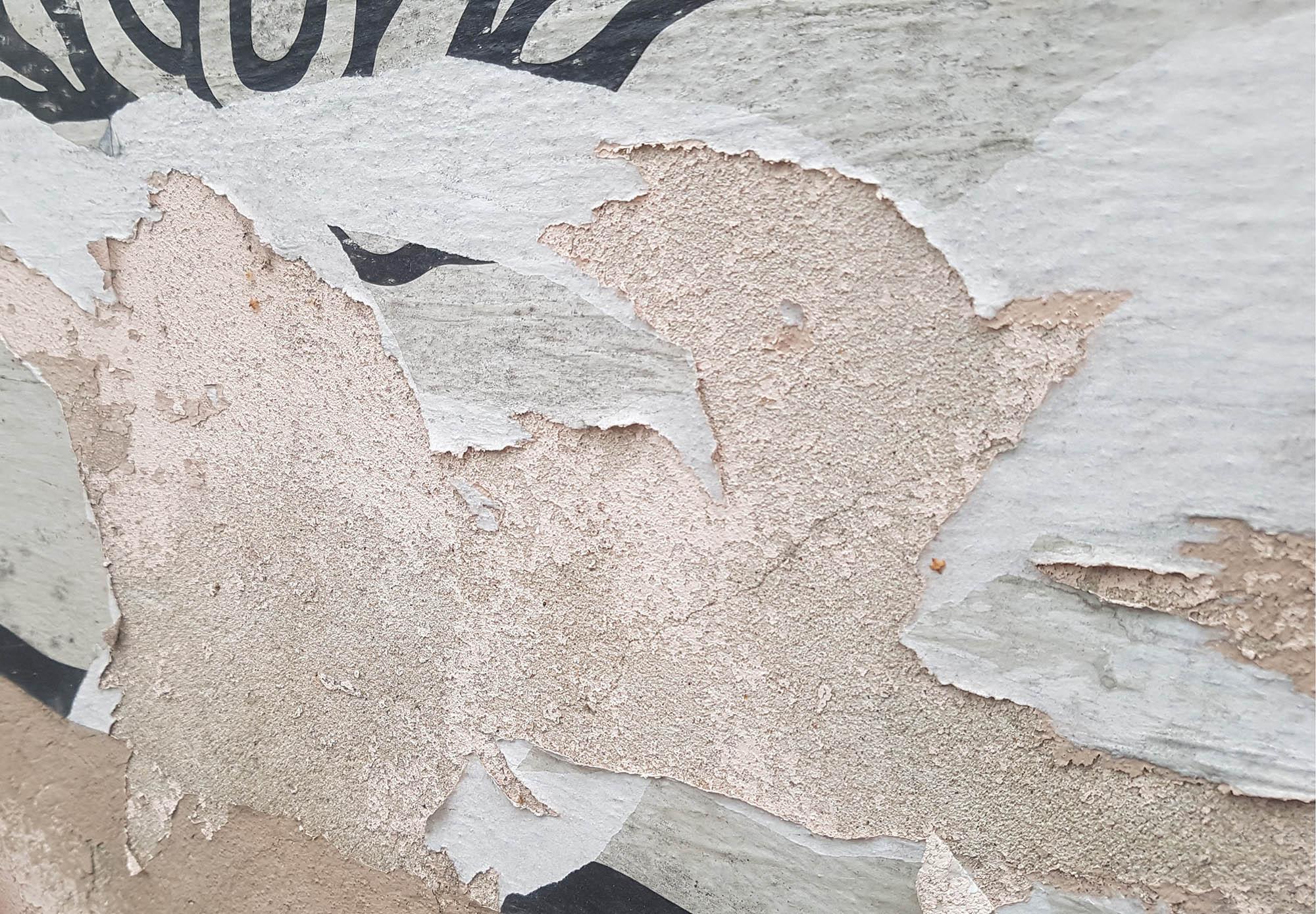 Neli mustvalget pilti on kleebitud müürile ja mingi kaitsva laki või muu lahusega kaetud; vaksa jagu ulatub kaitsevahendi jälg ka ümbritsevale müürile. Vaatamata sellele pildid lagunevad ja kooruvad mitmes kihis maha. Värvilisest pildist paremal oleval mustvalgel pildil on musta värvi tilgad, mida on ka pildi all müüril, ilmselt tahtlik tegevus, et jätta mulje, nagu oleksid pildid müürile maalitud. Värvitilgad või õigemini nired jooksevad ka värvilise lille mitmete detailide servadest alla. Ilmselt samuti tahtlik tegevus. Värviline lill on maalitud peale mustvalgete lillede seina kleepimist, kuna üks õie kroonleht katab vasakut pilti.