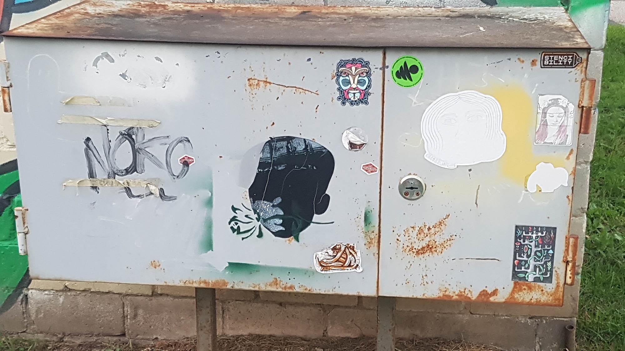 Selle suure seinamaali paremas all nurgas oli metallist tehnokapp, millele oli kleebitud Tartus teada-tuntud soniga mees, kel seekord oli hammasete vahele pandud šablooniga värvitud roheline roosiõis. Kapi esiküljel oli veel kiri NOKO, ja mitmeid kleepse, sh spreipudelil tekst „STENCI/BILITY“. Kapi parempoolsele tänavapoolsele otsale oli värvitud kummalise pea külgvaade.