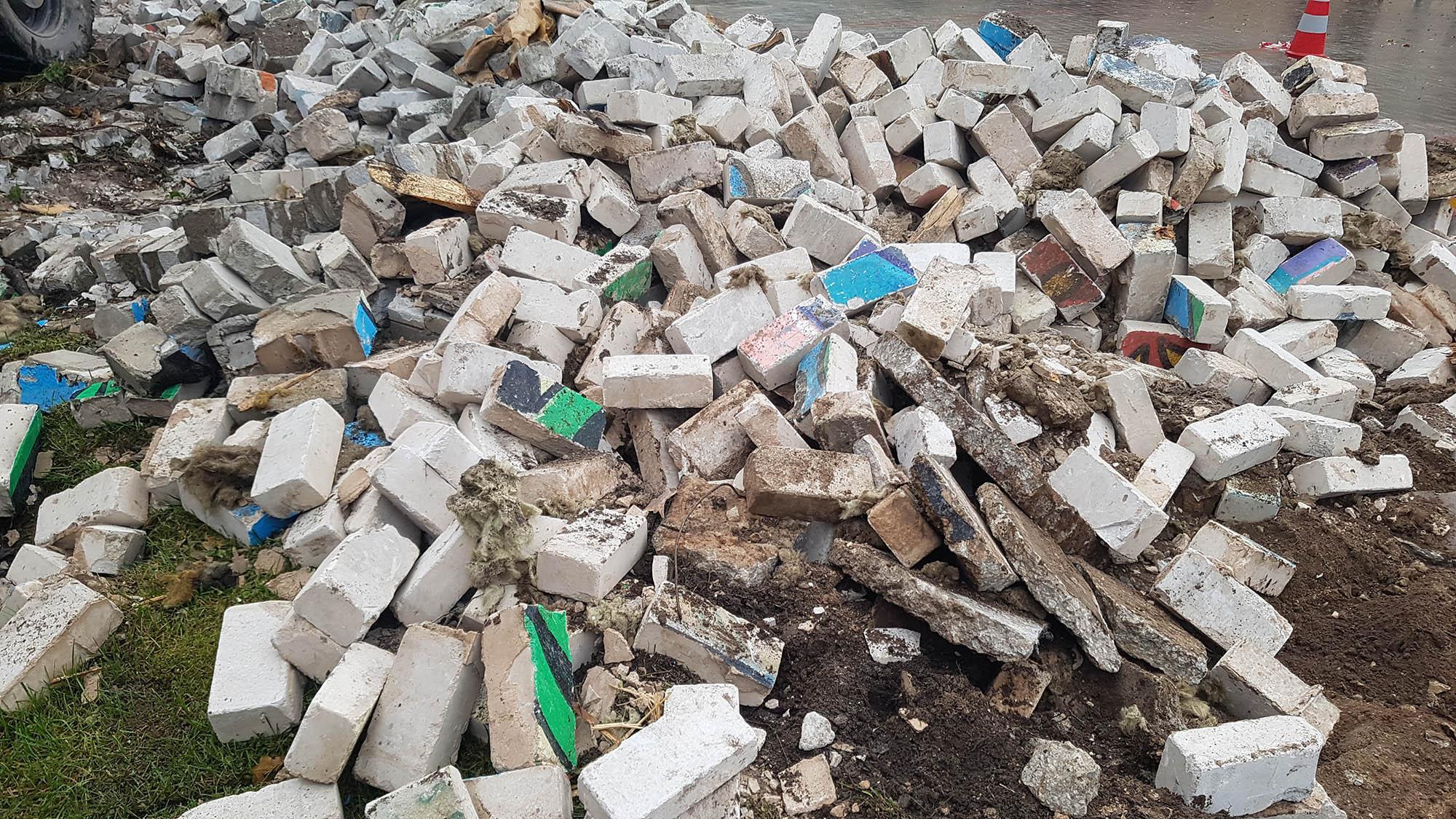 Nüüdseks on kõik läinud, 27.10.2025. a oli garaažide kohal vaid kivihunnik kus paistsid mõned grafitiga kaetud silikaatkivid.