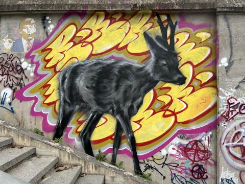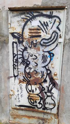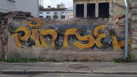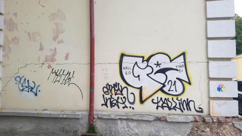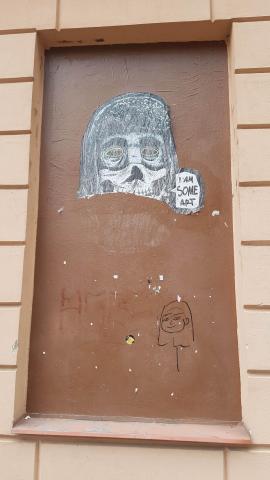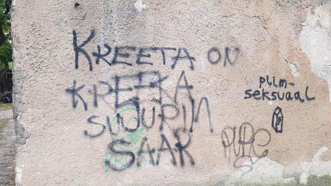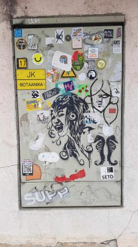 KREETA ON KREEKA SUURIM SAAR [ümmargune roheline nägu] PROST! / piim-seksuaal [piimapakk] P / SnjuhAn ELAB! [anarhiamärk ring-A] / Hing noor ja näljas [mehe nägu] / AHELDATUD. [mehe rinnaportree]