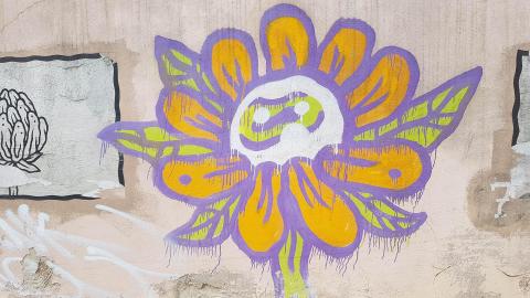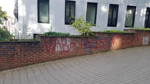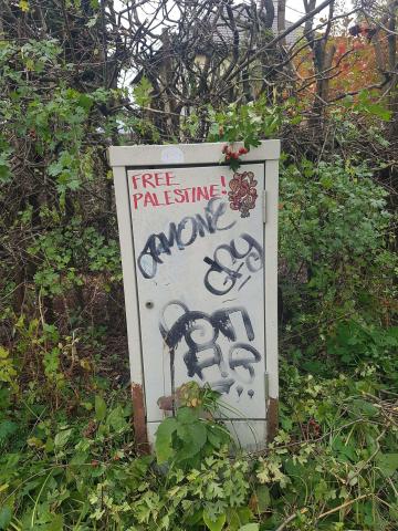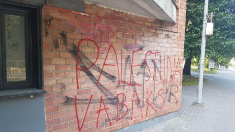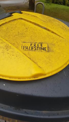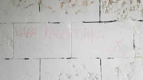 VABA PALESTIINA [punkanarhia märk: kohakuti A ja ringjoon]
