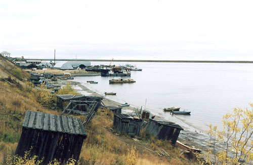 | It is a must for every proper Aksarka man to have his own speedboat - and a boatshed on the riverbank! In the background there is a fish-loading and cargo harbour. After the completion of Salekhard-Aksarka road, the river is not used for passenger traffic as widely as before |