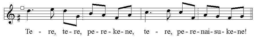 Tere, tere, perekene, tere, perenaisekene, laske mardid sisse tulla! Mardi küüned külmetavad, sõrmeotsad sõitelevad. Mardid tulnud taevaasta, tinast tehtud teeda mööda, mööda kullastā kõrčndaid. Peretütar, neitsikene, puhu tuli toassa, lõõtsu lõke lõukaasse! Kui pole peres piirukesta, siis võta laest laastukesta; kui pole laes laastukesta, siis võta roogu räästaasta; kui pole roogu räästaassa, siis võta narest pinnukesta, siis puhu tuli toassa, lõõtsu lõke lõukaasse. Peremees, peremehikene, perenaine, naisekene, võta võtmed varnasta, nõretimed nõtkemasta, kõpsi-kapsi kammerisse, astu alla kellerisse, otsi mardilč osāda, katsu mardilč kalāda, vana venda, vorstikesta, sandimardi maugukesta, sealiha siilakuida, põrsa päid, poolikuida!