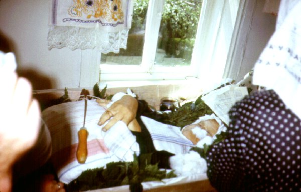 Surnu puusärgis. Kõhule on pandud sirp, sõrme ümber põimitud traat on mähitud ka ümber sirbi, traadi teine ots läheb aseme all olevasse mullaga täidetud anumasse, et oleks "maaühendus". Surnu ümber on nõgesed, paremal pool pea kõrval on klaaspurk kaaliumpermanganaadi lahusega. Akna kõrval seinal on pühaserätt kõrgapatsja, mille all kadunu hing viibis kodus kuue nädala jooksul. 1989 a juuli Povodimovos. Foto Riin Alatalu |