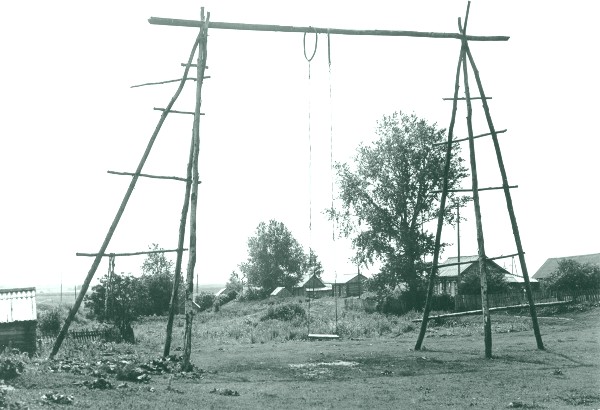 | 1984. a. lihavõtteks püstitatud kiik. Suurem kiikumine toimus kolm päeva pärast lihavõtet. Mordva ANSV, Kovõlkino raj., Mordovskie Avgurõ k. J. Karm, 1985. (Fk 2131:26) |