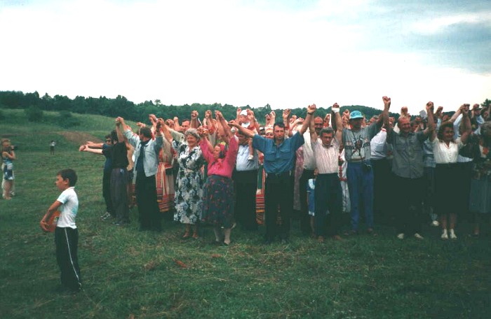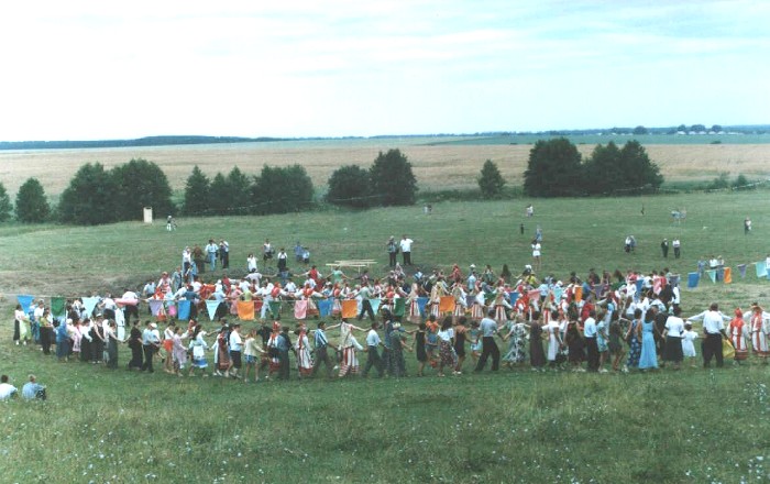 | Mordva rahvuspüha Ras'ken' Ozks. Pidulistest (üritusel osales eri hinnalguil 1500-2000 ersat nii Mordva Vabariigist kui mujalt) moodustus suur inimkett, mis ansambli "Torama" juhi Vladimir Romashkini eestvedamisel väljal võimendist kostva rahvalaulu Virev mol'an (Lähen metsa) saatel ringmängus hiiglaslikke kujundeid moodustas. I. Särg, 1999. (*) | |||||||||