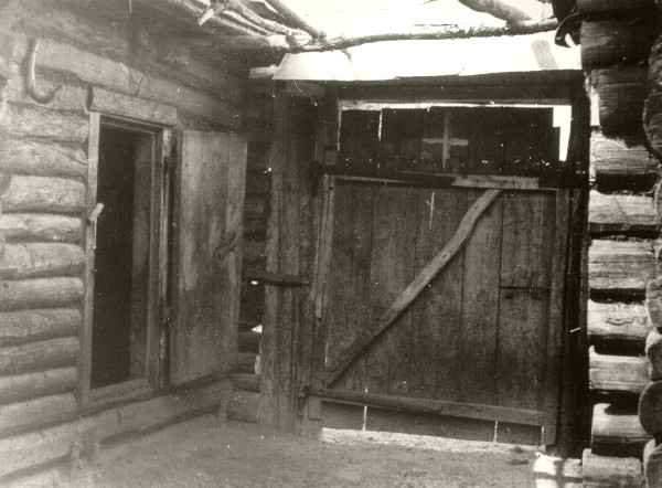 | Kinnine õu: paremal elumaja nurk, vasakul laudad. Väraval rist maja kaitsemärgina. Pensa kub., Krasnoslobodski mk., Valgapino k. (Mordva ANSV, Kovõlkino raj.) E. Saarde, 1965. (Fk 1437:58) |