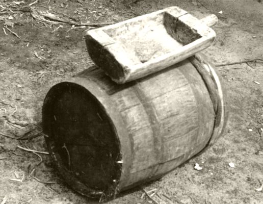 ![]() 'Võtame kuivikud, teeme pärmi, võtame suure toobri, sinna keev vesi; hiljem valame sinna kuivikud ja pärmi, suhkru; kolme päeva pärast tuleb see kali kurnata läbi marli, saab juba juua'. |