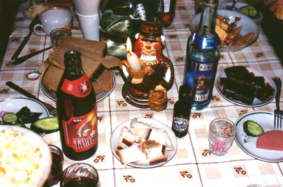 | Sünnipäevalaual mordva õlu «Tolstjak», viin, soolapekk. Kala on tervelt suitsutatud (külmsuitsu) heeringas. Mordva, Saransk. I. Särg, 1999. |