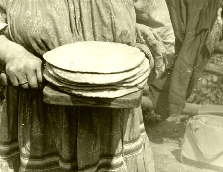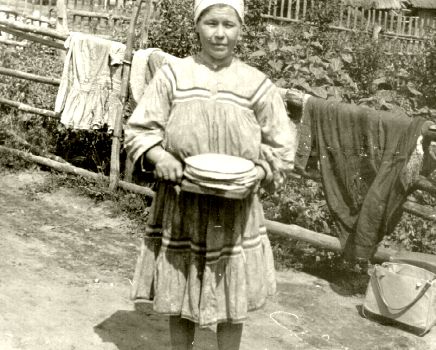 | Rahvarõivais naine omaküpsetatud bliinidega. Tagaplaanil piirdeaial tuulduvad riided ja juurviljad. Mordva ANSV Kovõlkino raj. Valgapino k. E. Saarde, 1965. (Fk 1437:61) | Omaküpsetatud bliinid nisujahust. Asetatud neljakandilisele, käepidemega lauakesele. Mordva ANSV Kovõlkino raj. Valgapino k. E. Saarde, 1965. (Fk 1437:62) |