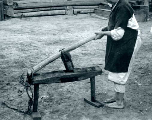 | Rahvariietes naine kartulipressiga. Sellega pressiti II maailmasõja ajal kartulitest mahl välja. Kartulimassist tehti leiba. Mordva ANSV Zubovo-Poljana raj. Podljassovo k. E. Saarde, 1965. (Fk 1437:175) |