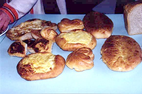 | Folklooriansambli «Sjul'gamo» liikmed laua ääres omatehtud pirukatega. Äärmistel on tshevgen'prjaka, keskmisel pooleks lõigatud ümmargune kopsha. Mordva, Murani k. T. Särg, 1999. |