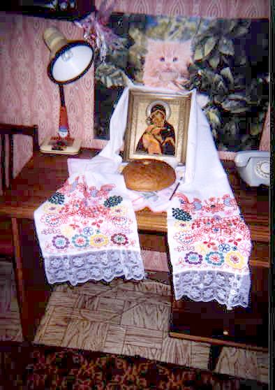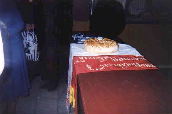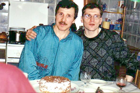 | Laual on Olga Rjabova küpsetatud kook lambambu prjaka. Laua ääres istuvad (vasakult): Nikolai Rjabov, Indrek Särg. Mordva, Taula k. (Podlesnaja Tavla). T. Särg, 1999. |