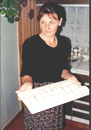 | Olga Rjabova ersa pelmeenidega. Mordva, Taula k. (Podlesnaja Tavla). I. Särg, 1999. | Kuju «Laul» (1998), autor: Aleksandr Rjabov. Parempoolse kujukese käes on traditsiooniline kink pirukas kurnik. Taula küla kunstikool (Podlesnaja Tavla). I. Särg, 1999. |