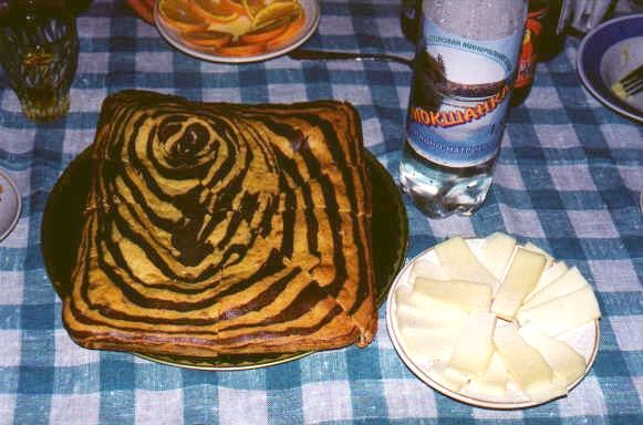 | Pr. Romashkina tehtud kook tort "Zebra", mordva mineraalvesi ja juust. Saransk, Vladimir Romashkini kodus. I. Särg, 1999. |