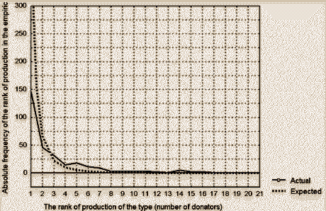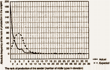 One may assume that generally, the distribution of typological units in their usual folkloristic sense (or some other discrete units of folklore), either drawn on the productivity scale or on the scale of dissemination power, resembles the distribution of lexical units in a natural text fragment (the so-called Zipf's Law), or of wealth in developing countries (the so-called Latin-American model), which means that there is a great number of "small" (~"poor" ~rare ~unproductive) units or individuals, an average number of medium ones, and very few "big" (~"rich" ~frequent ~productive) ones. On the diagram, this is reflected in a left-hand position of the mode.
