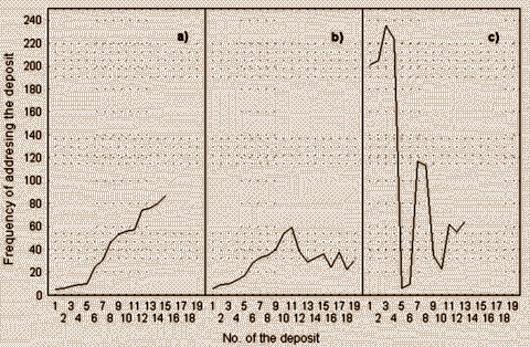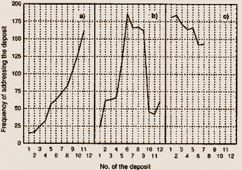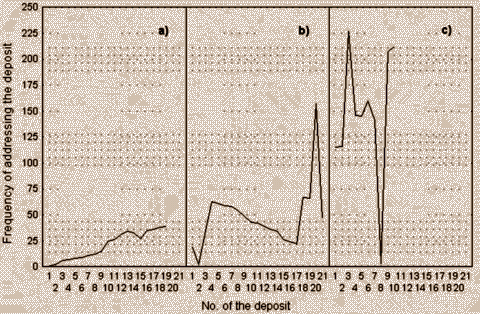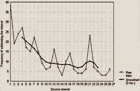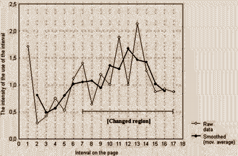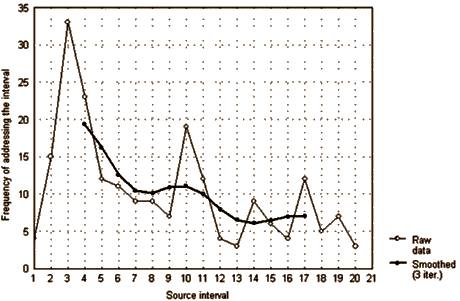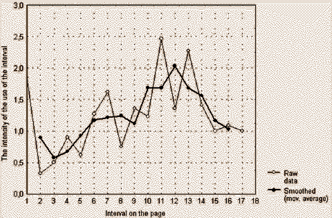 The material found in a source has been divided into intervals in a "normal" direction - from left to right along the x-axis, which corresponds to the reading of a book from beginning to end. The intervals contain texts or riddle "deposits", and the diagrams illustrate the dynamics of the addressings of each interval in total; to describe the general reaction, a smoothed curve (3rd iteration) has been added to the diagram of raw data.