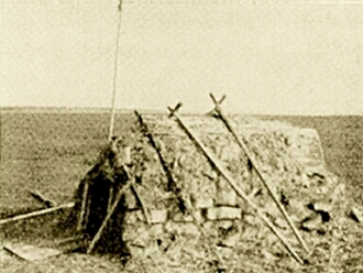 3) Iga külal oli oma õlest unikas - noodamaja. Kaks korda puid maha, sõnna külge ollid sarikud nakutet ja õlekatus peal. Otsas olid pissed augud, kust suits välja käis. Keskel oli kätel. Pael oli ülal, kook paela otsas, koogu otsas kätel. Kena ilmaga keedeti tuleaal. Tuleaed: kivid rinki.