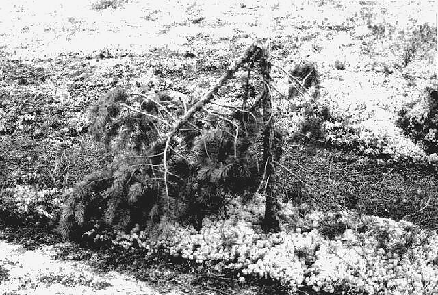 Noored puud murtakse hantide poolt kahekorra, ladvaga mineku suunas (VM 1992, foto 3).