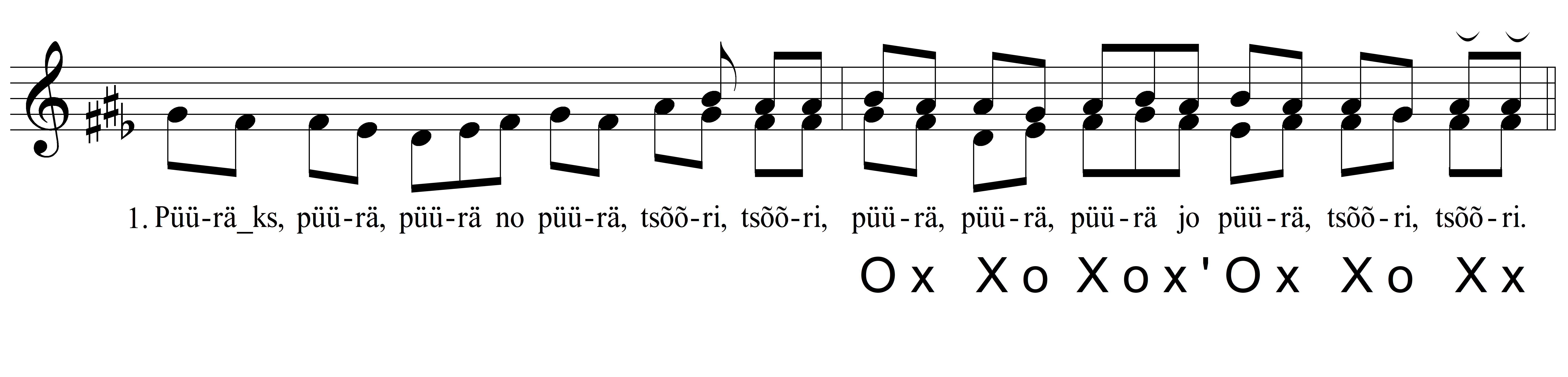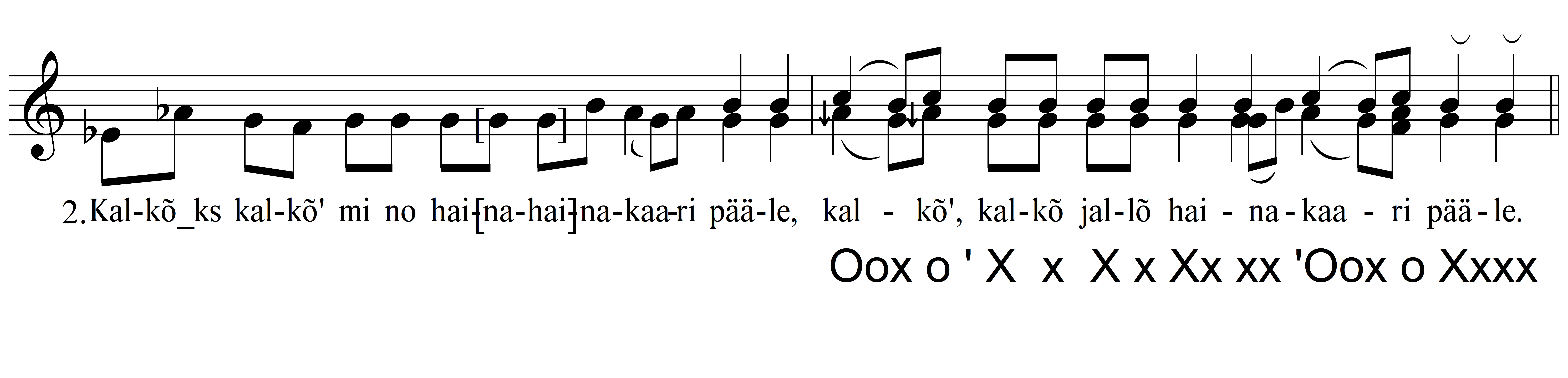 Näide 2 illustreerib, kuidas on määratud konkreetse viisi harmoonilise rütmi mudel. Harmoonilisi komplekse tähistan sümbolitega X ja O. Pooltoon-poolteisttoon-laadis tähistab sümbol X kompleksi d-fis-ais ja sümbol O kompleksi es-g-h. Neist kompleksidest on viisis kasutatud astmed fis-ais ja g-h. Lõpufunktsiooniks (n-ö „toonikaks“) on selles lauluesituses kompleks X. Harmoonilise rütmi sümbolid on grupeeritud vastavalt viisi meetrumimudelile, mis sõltub omakorda teksti ja viisi rõhurühmadest. Meetrumi- (või rõhu)rühma alustav funktsioon on tähistatud suurtähega. Harmoonilist rütmi olen määranud ainult kooriosas, kuna harmoonilised seaduspärasused avalduvad selgemalt mitmehäälsuses ja kooriosa struktuur on eeslaulja osast märksa stabiilsem.