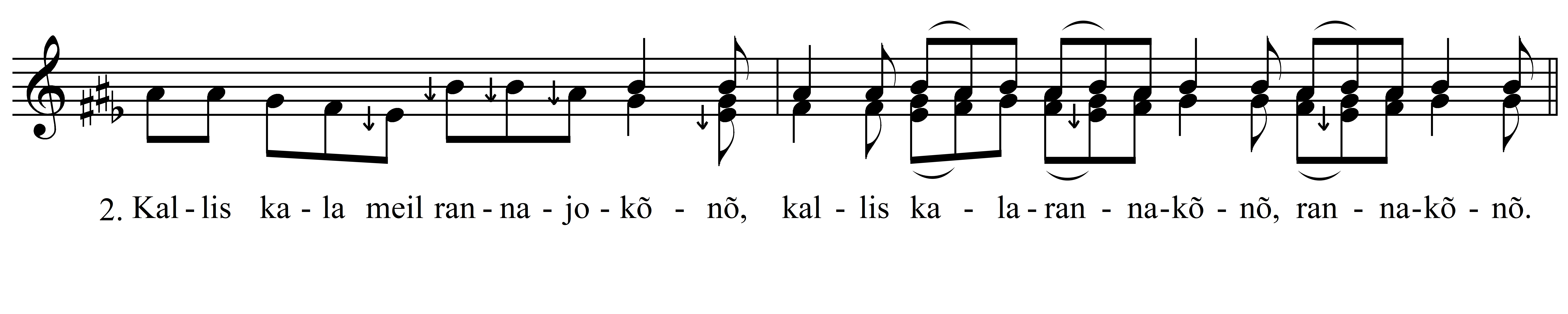 Näide. Seto leelo mitmehäälne faktuur. Kalaranna laul, Anne Vabarna kooriga, Tonja k., 1936 (ERA, Pl. 22 A2).