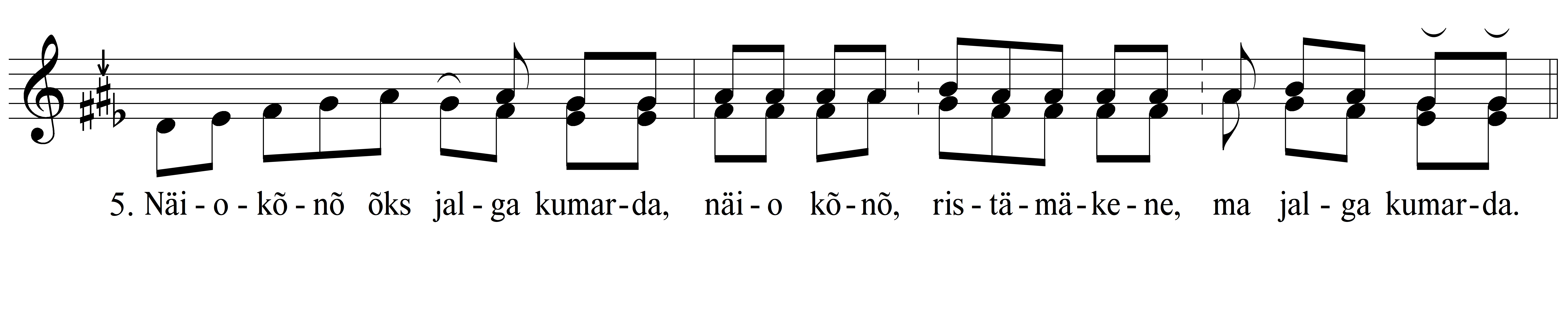 Näide 3. I rütmisüsteem; meetrumilöögiks on kaheksandiknoot. Mõrsjaitk ristiemale, Irina (Ir´o) Liivik kooriga, Meremäe v., 1937 (ERA, Pl. 71 A2).