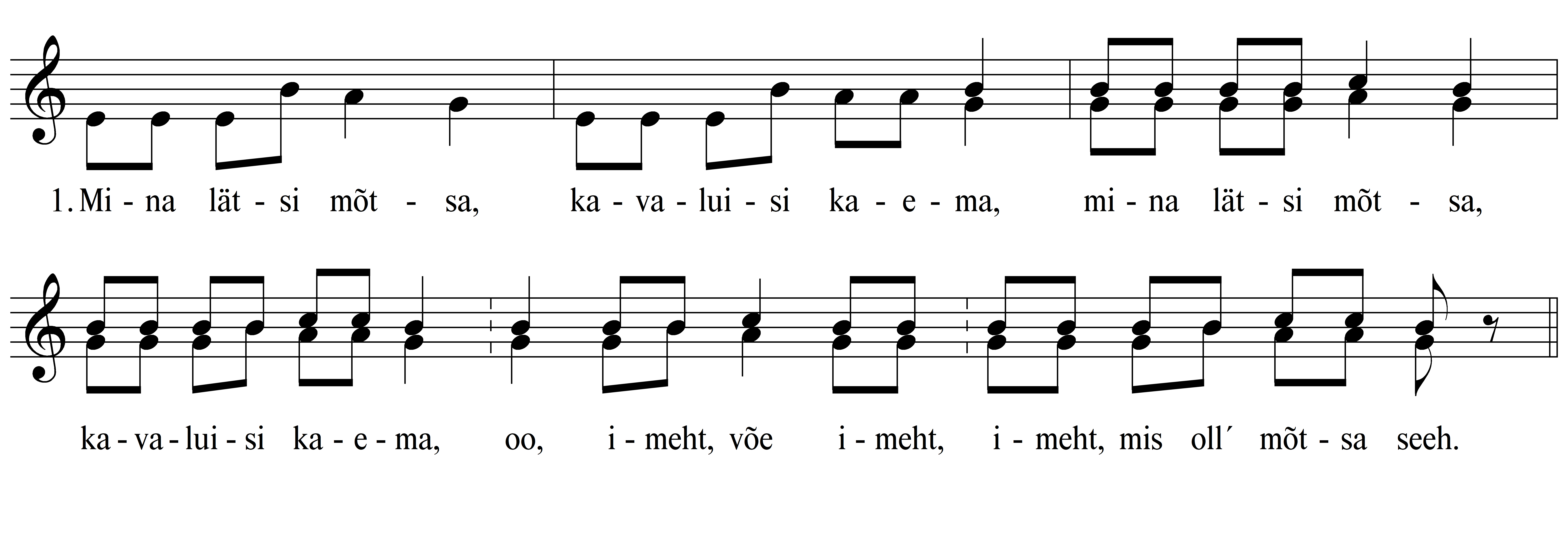 Näide 1. Süllaabiline rütm. Kalmuneiu (lüroeepika), Elena (Oll´o) Laanetu kooriga, Suure-Rõsna k., 1972 (RKM, Mgn. ER 55 (1)).